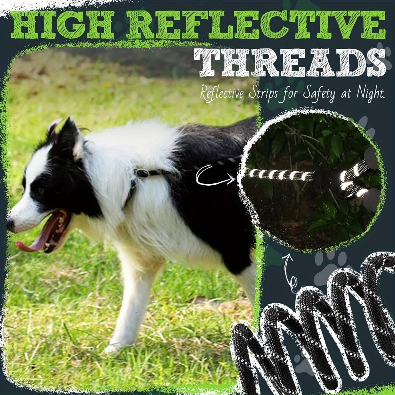 Take your daily walks to the next level with this durable and comfortable dog leash designed for control, comfort, and safety. Made with a strong climbing-grade rope, this leash features high-visibility reflective threads for nighttime safety and a soft foam handle to protect your hands on longer walks.